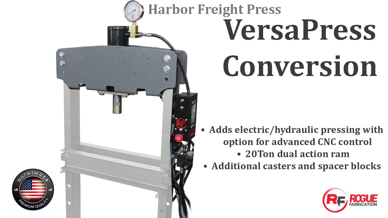 Convert your Harbor Freight press into a Rogue Fab VersaPress! Add the convenience of electric/hydraulic pressing with the option for advanced CNC-ready pressure control. This press uses a 20T dual action ram and can be run off its stand-alone hydraulic system, or you can purchase a set of quick disconnect fittings to run it off the 2HP unit already attached to your Rogue M600 Series bender. Additional options include an xHD Caster kit and spacer blocks for 4 1/4″ or 4 1/8″ press frames. Configure your ideal setup and elevate your shop press game today!